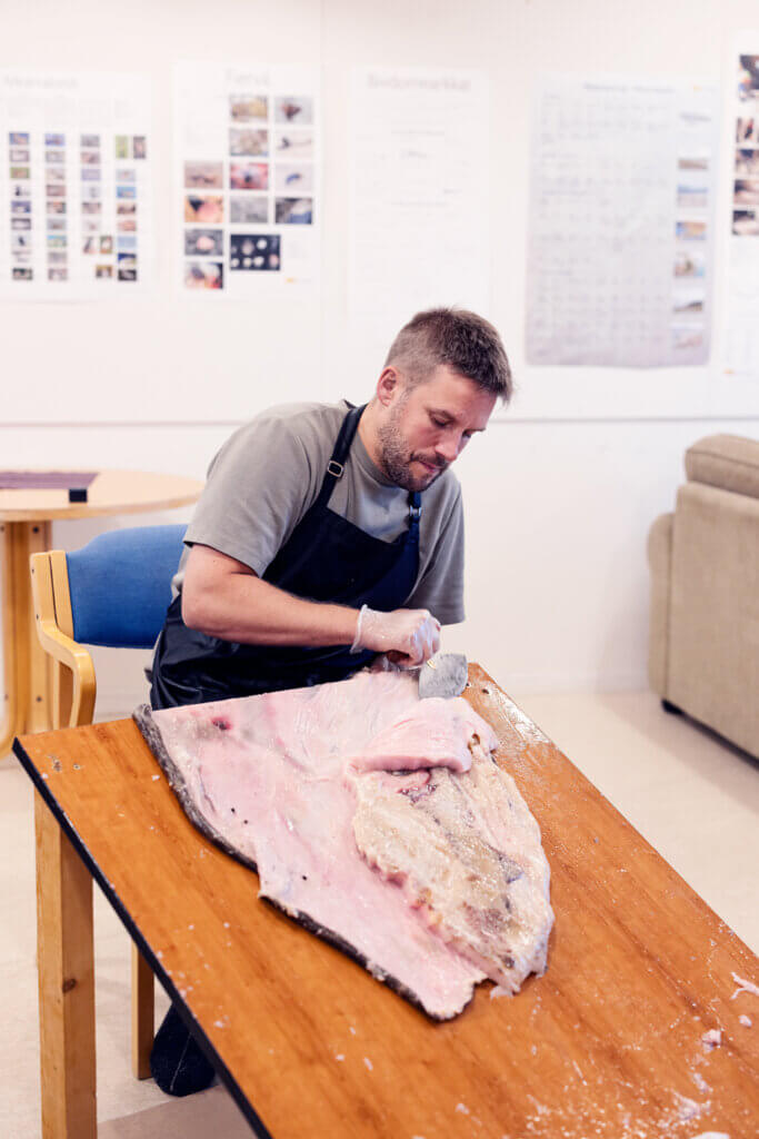 Im Verlauf des Abends zeigte Stødle den kompletten Prozess der Seehundhautfertigung — vom Abschaben des Fetts, über das Waschen der Häute bis hin zum Spannen in einen Rahmen für das effiziente Trocknen. Die Teilnehmer wurden eingeladen, selbst das Säubern zu versuchen, was den Workshop sowohl lehrreich als auch interaktiv machte.